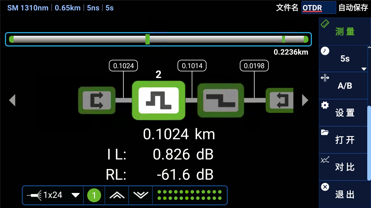 OT-200系列不仅可以完成基础的MPO全通道OTDR链路相关分析,也可直接使用光开关控制多芯链路制定通道出光。该软件在UI界面上也针对性地做出了设计,在右上角通过仿MPO端面正视图的方式实现当前链路可视化,提高用户的测试效率。