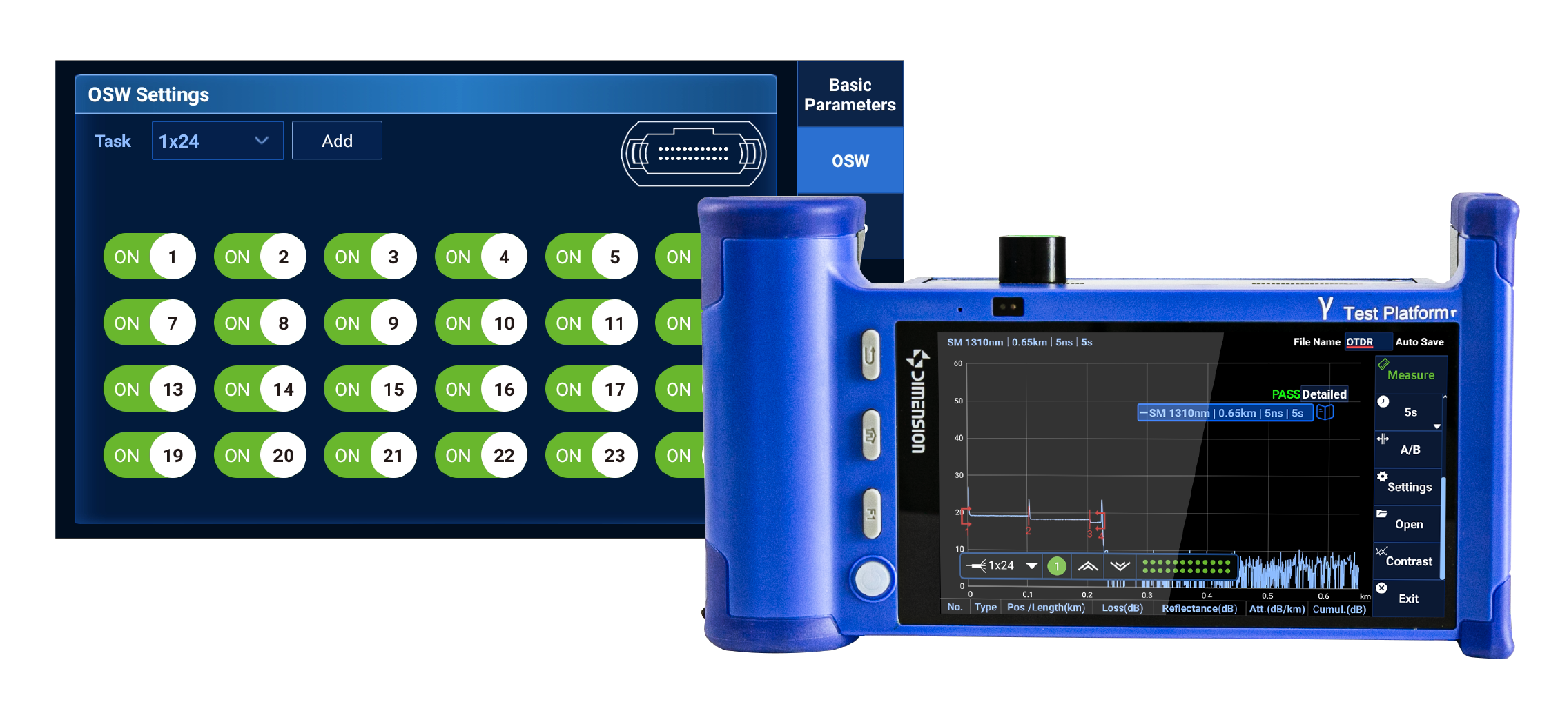 Dimension的OT-200系列将多芯光开关与OTDR相结合,自主研发生产了一款针对多芯高密集部署需求进行专项优化,适配各种光纤链路应用场景的设备。该设备支持多芯光纤一站式故障诊断,最高可覆盖24芯光纤,彻底取代传统“手动切换光路,多少芯测多少次”的方式,显著提升部署效率,同时大幅降低技术人员的运维难度。
