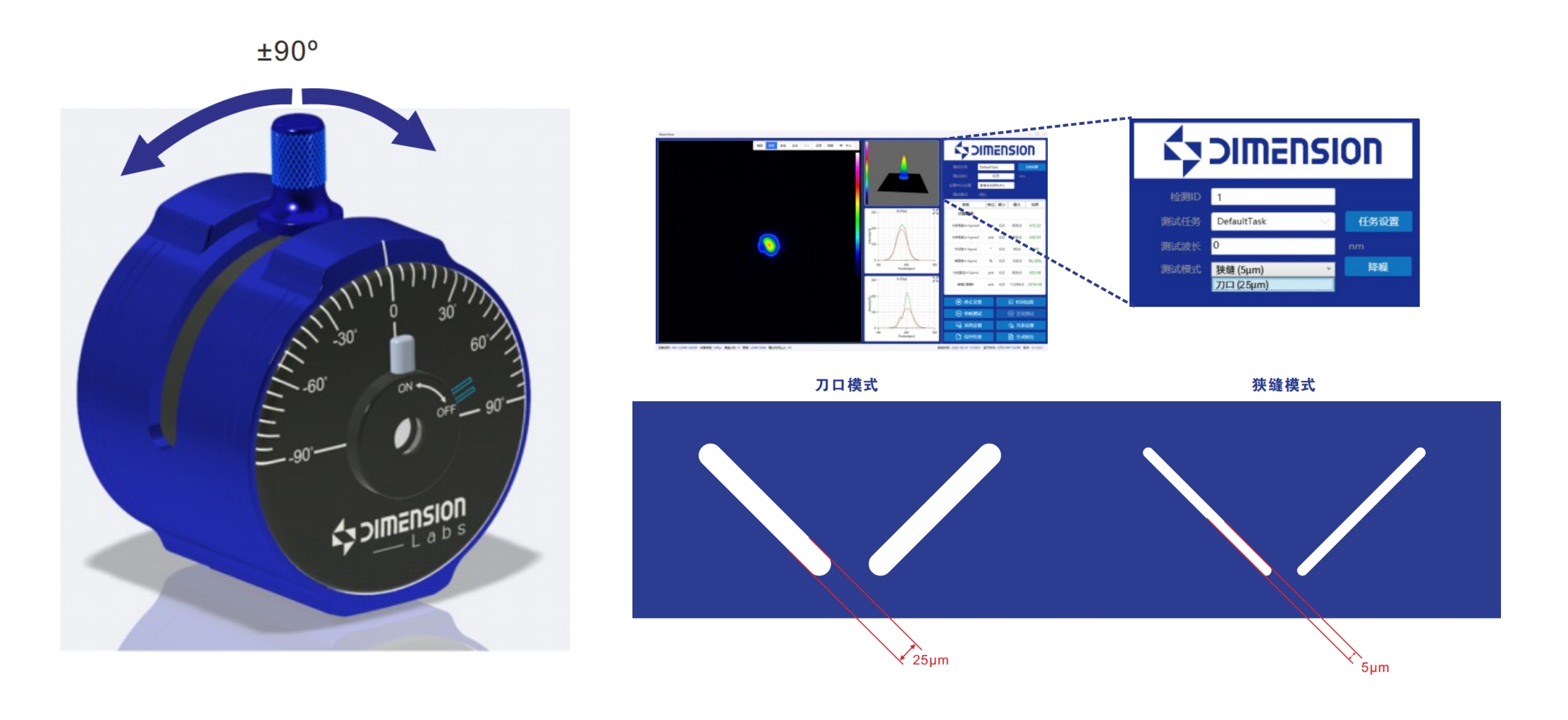 Dimension-Labs全新推出的扫描狭缝式光斑分析仪,转筒在垂直激光入射方向上做到±90°调节范围,以便用正面标识的XY轴对应一个光斑的长短轴,输出更精确的光斑模拟与测量。