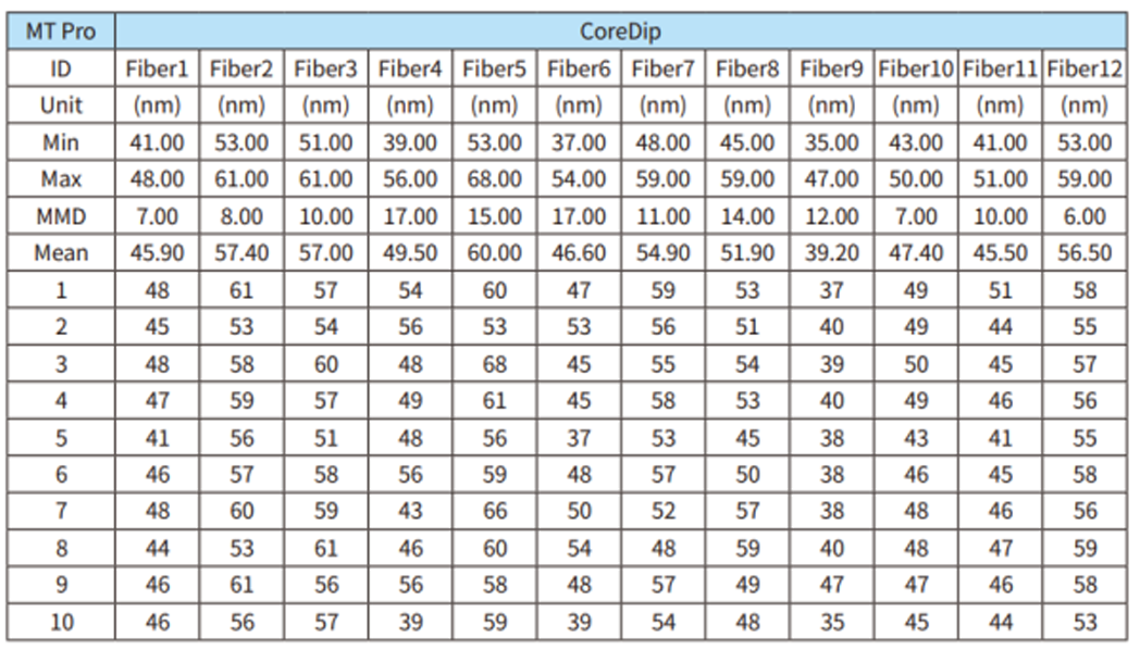 MT Pro 的软硬件设计极大的提高了测试的速度,12 芯 MT 连接器的测试 5 秒钟内完成,单芯产品检测 0.5s 内完成。